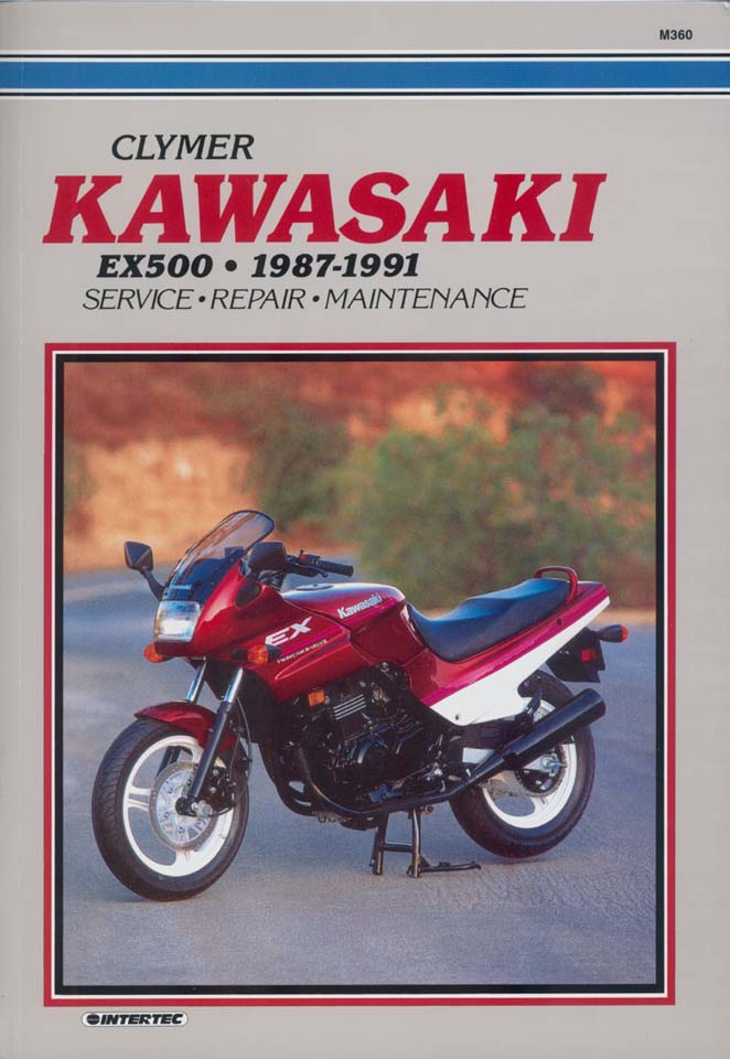 Clymer reparationshandbok för Kawasaki EX500 / GPZ500S / Ninja 500R landsvägsmotorcyklar årsmodeller 1987–2002. Verkstadshandboken innehåller tekniskt korrekt information för service, felsökning, demontering och montering.