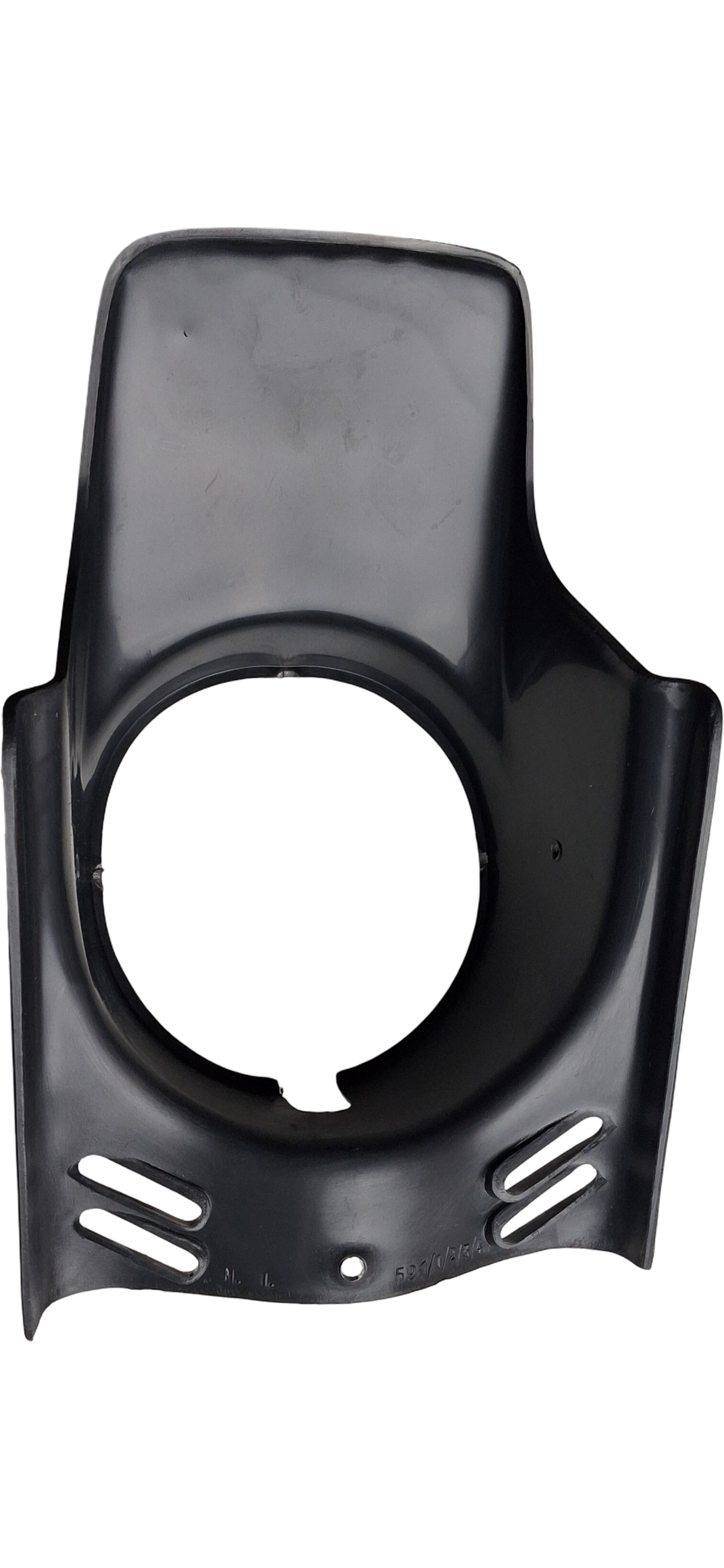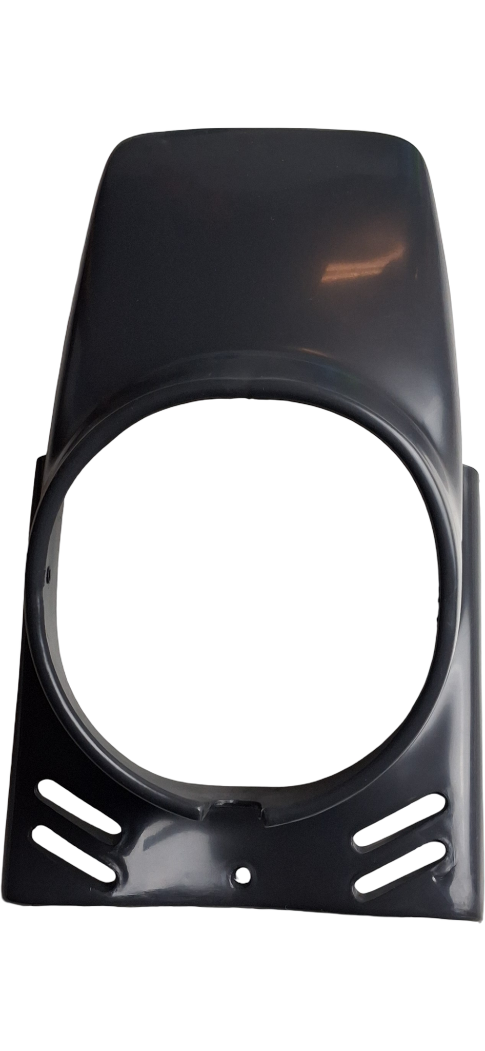 Rund framljusspoiler i svart, avsedd för Puch Maxi och liknande modeller. Spoilern monteras runt framljuset för ett stilrent utseende och lätt skydd av lampglaset.