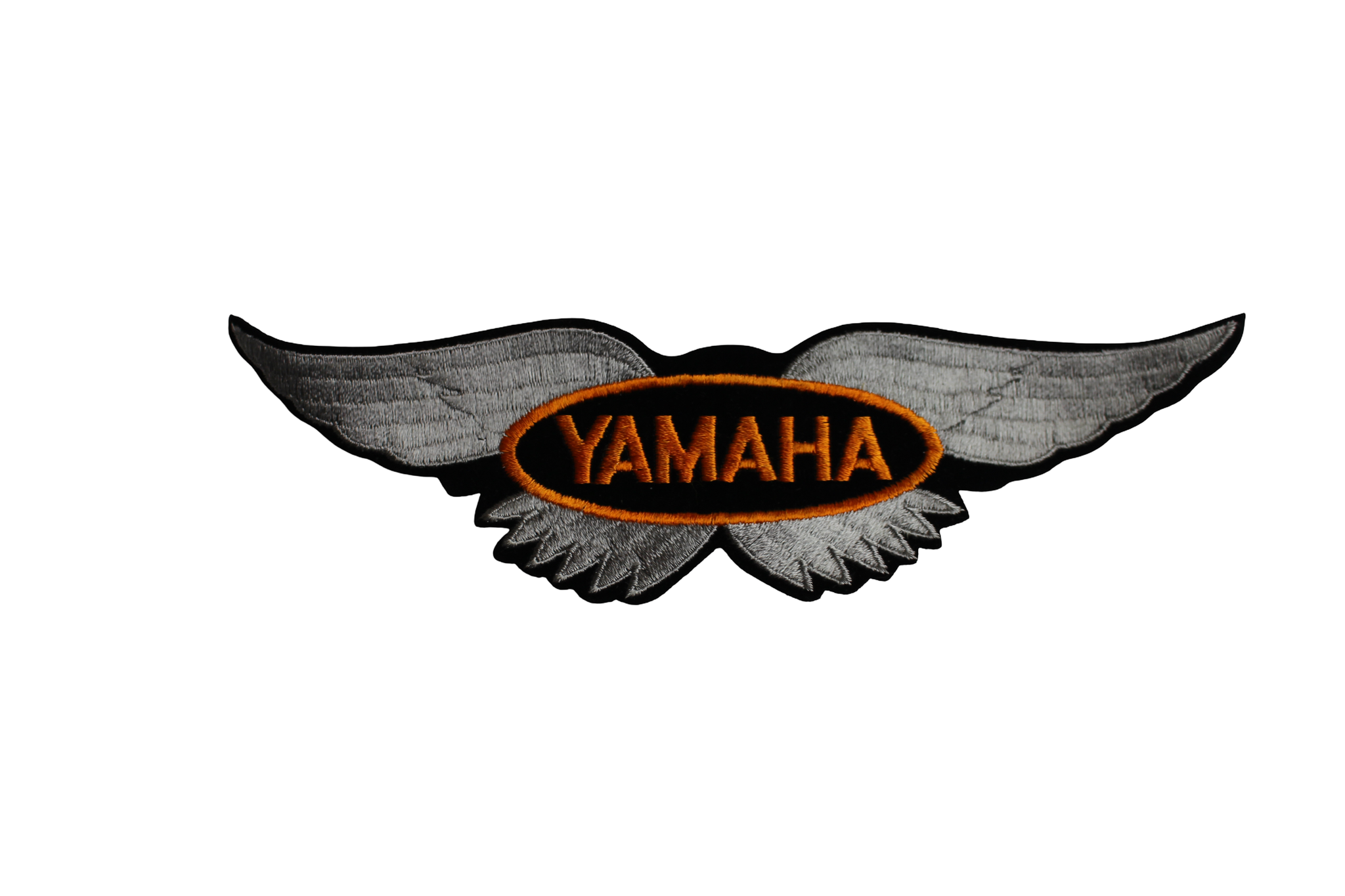 Tygmärke med Yamaha-vinge och YAMAHA-emblem, utfört med mycket tät brodyr för hög detaljskärpa och hållbarhet. Märket är 27 cm långt och 8 cm högt och lämpar sig väl för montering på jacka, overall, väska eller annan textil.