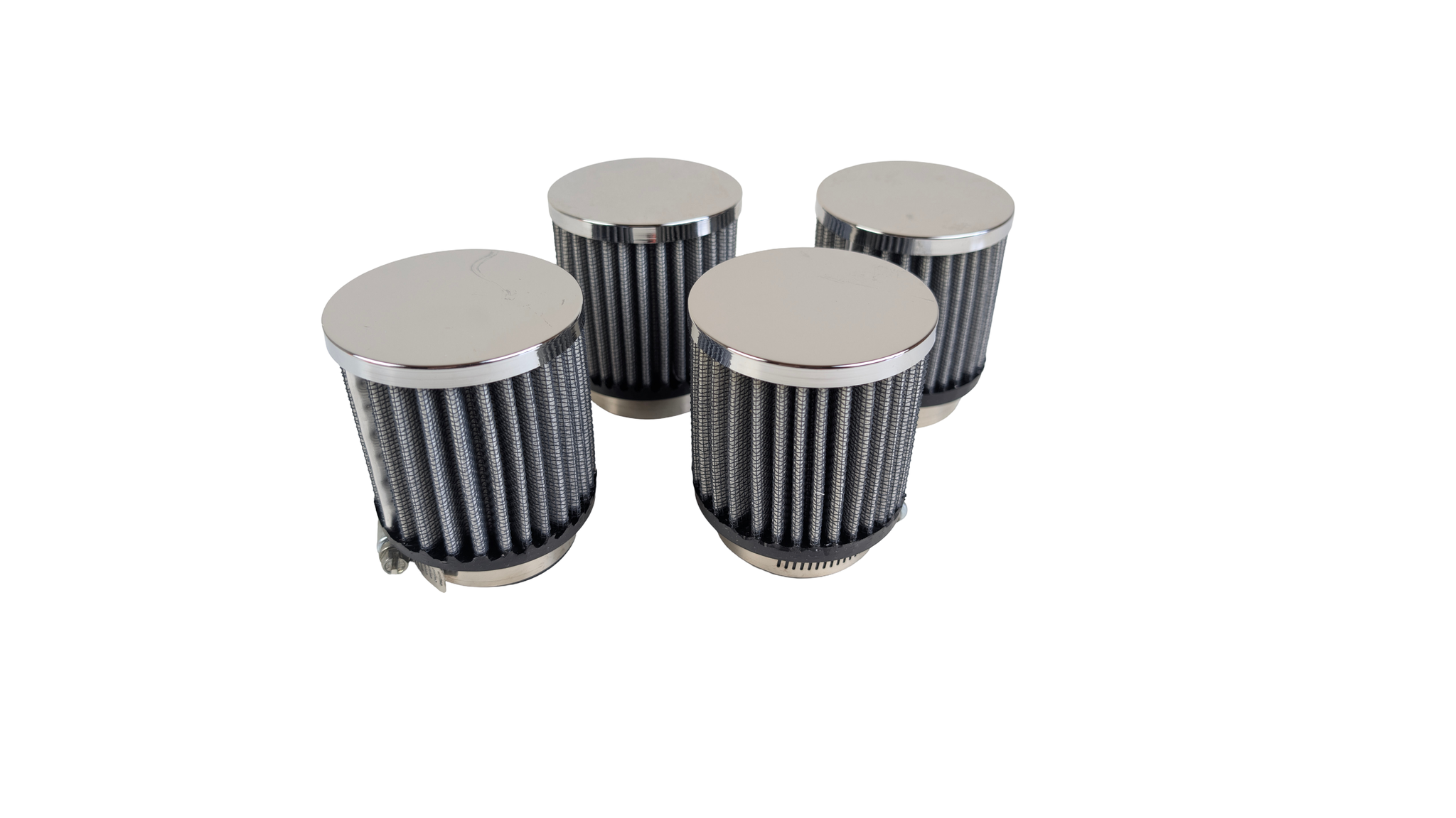 K&N runt högeffektfilter. Levereas i satser om 4 filter. KROMAT lock. Insugningshål 54mm (2-1/8) i centrum på filtret. Flänsen är 16mm