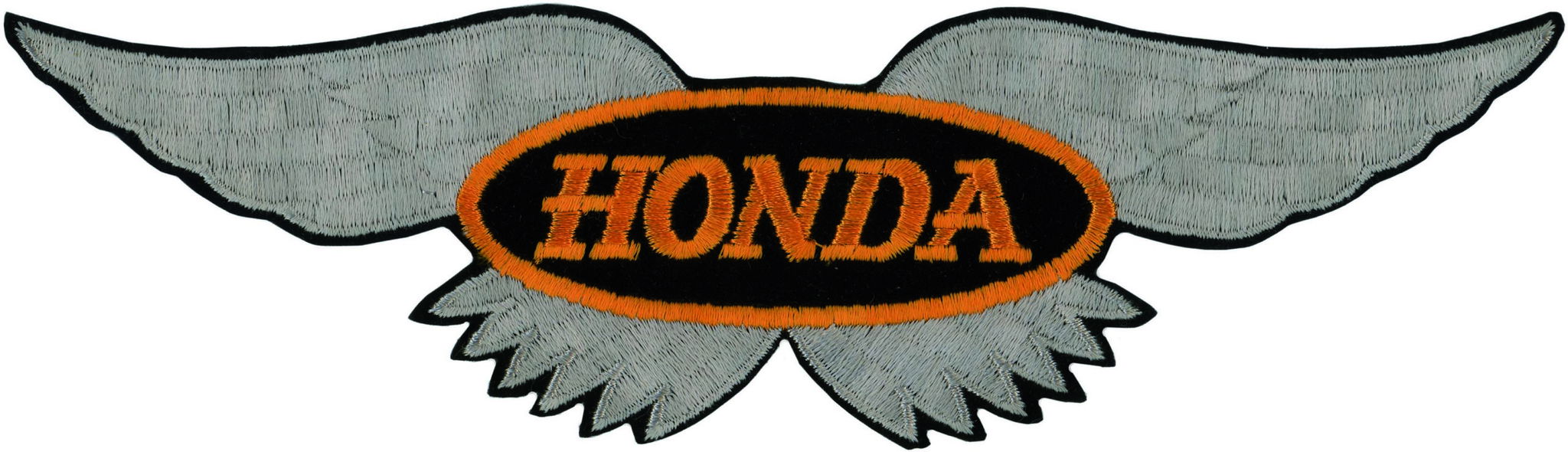 Geborduurde Honda-vleugel patch met HONDA-embleem, uitgevoerd met zeer dichte borduring voor hoge detaillering en duurzaamheid. De patch is 27 cm lang en 8 cm hoog en geschikt voor jassen, pakken, tassen of andere textieltoepassingen.