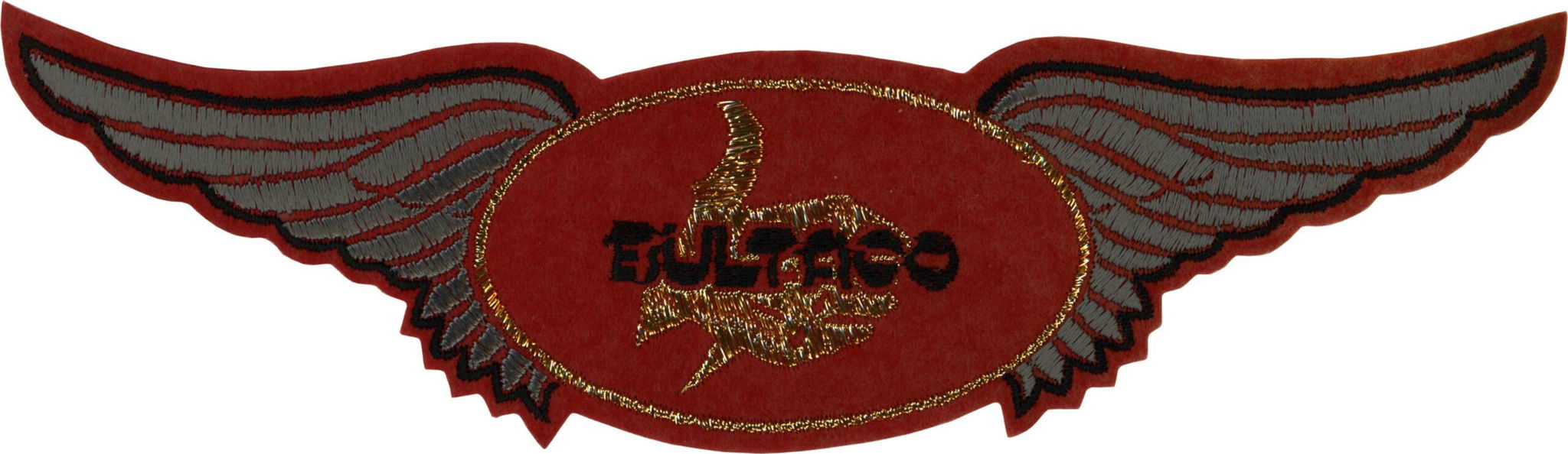 Geborduurde Bultaco-vleugel patch, uitgevoerd met zeer dichte borduring voor hoge detaillering en duurzaamheid. De patch is 29 cm lang en geschikt voor jassen, pakken, tassen of andere textieltoepassingen.